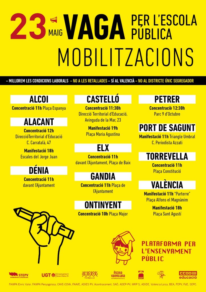 El proper dijous 23 de maig hi ha una vaga per l’escola pública convocada des de la Plataforma per l’ensenyament públic arran de les retallades del Govern de la Generalitat que afecten a l’ensenyament públic valencià. En els pressupostos de 2024, s’han retallat més de 121 milions d’euros del Pla Edificant, destinat a la construcció i rehabilitació de centres públics, una reducció del 40% respecte a 2023. S’han suprimit 150 línies d’escoles públiques sota l’argument de la disminució de la natalitat, en comptes d’aprofitar aquesta situació per fer una reducció de ràtios que seria molt beneficiosa tant per a l’alumnat com per al professorat. Pel que fa al valencià, les actuacions del govern van en contra del criteri dels sindicats de professorat, les associacions de pedagogs i la pròpia universitat que forma professorat i educacors, els quals ja han manifestat públicament la seua oposició a la retallada del valencià a l’escola. De fet el Consell de Govern de la Universitat de València ha aprovat un informe en el qual qualifica la futura norma com a “innecessària, discriminatòria i recessiva” i adverteix que “trenca el consens conformat al voltant de la Llei d’Ús i Ensenyament del Valencià (LUEV) al llarg de quaranta anys”. A més, el govern de la Generalitat ha anunciat la gratuïtat de l’educació infantil de 0-3 anys, però el sistema triat és el de subvencionar les escoles privades, en comptes de crear-ne de públiques. D’altra banda, s’ha publicat el nou decret d’admissió que recupera el districte únic. Això significa que alumnes de localitats, com El Saler o El Palmar, competiran amb els mateixos punts per accedir a la nostra escola amb els alumnes de València. Això podria ocasionar que famílies de les rodalies no pogueren accedir a la nostra (seua) escola.Què podem fer les famílies? El proper dijous podem recolzar la vaga no duent els nostres fills i filles al centre i acudint a la manifestació que es farà de vesprada a València a les 18.00h, que ix des de la plaça de Sant Agustí.
